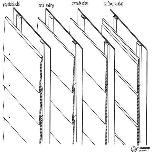 Een potdekselplank ziet eruit als een normale plank. Bij Zweedse rabatdelen/ Zweedse potdeksel planken ziet de plank er anders uit, maar werkt het stapelen wel hetzelfde. Bij Zweeds rabat schuiven de planken als het ware over elkaar heen. Dat komt doordat het een toelopende plank is met een messing en groef.