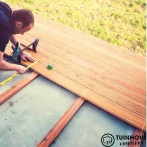 Planken leggen – Leg het vlonder hout met een kleine tussenruimte voor afwatering. Dit voorkomt vochtproblemen en kromtrekken van de planken.
