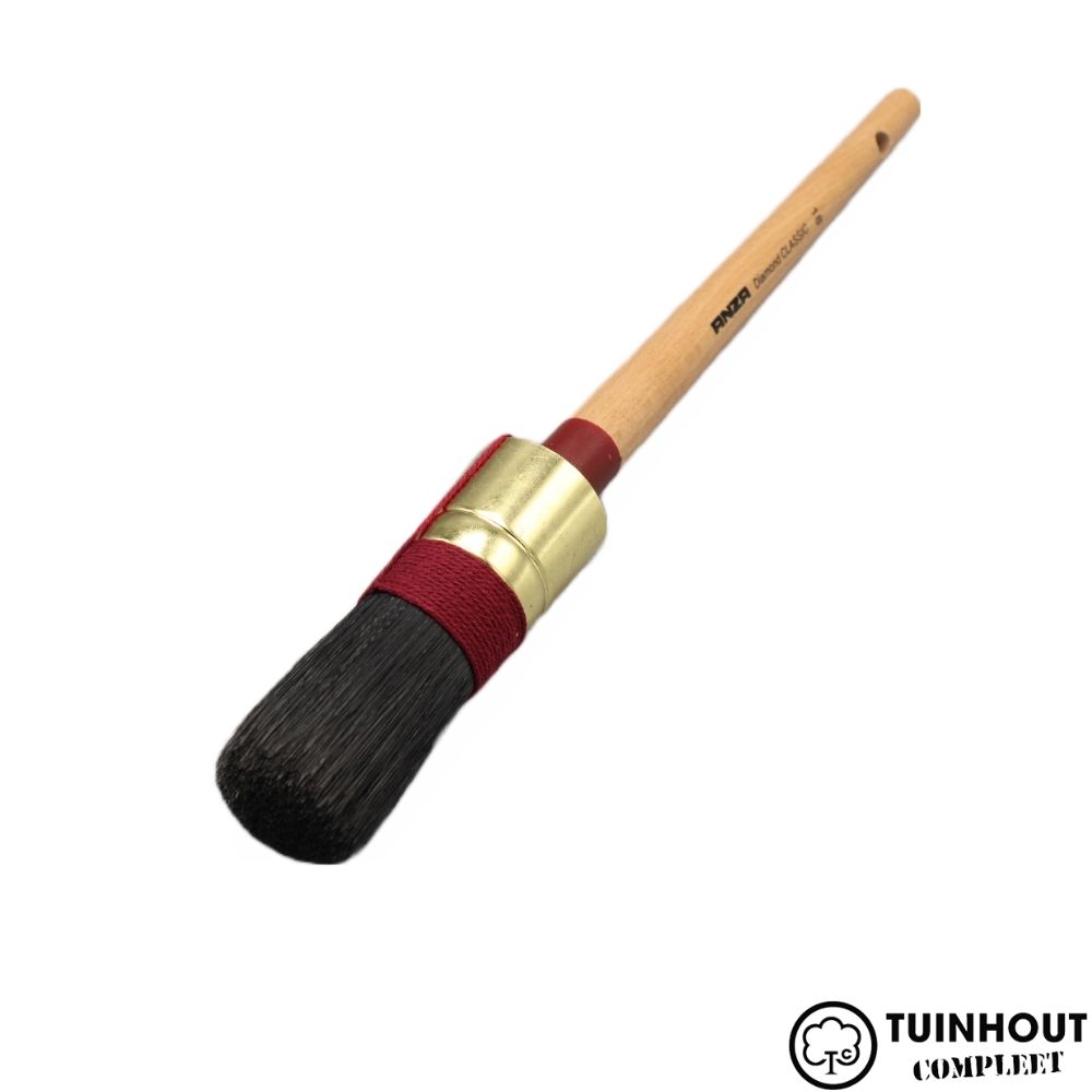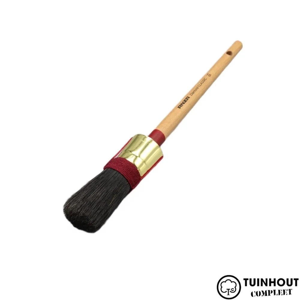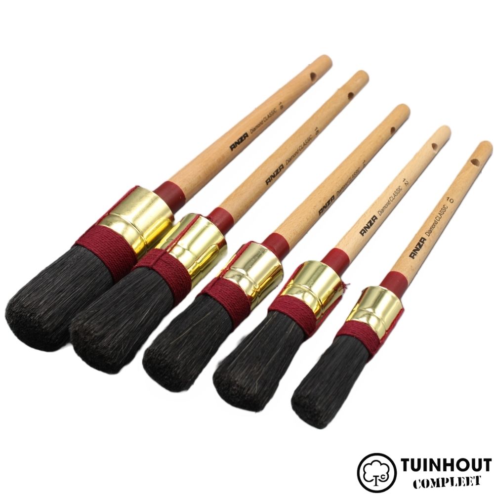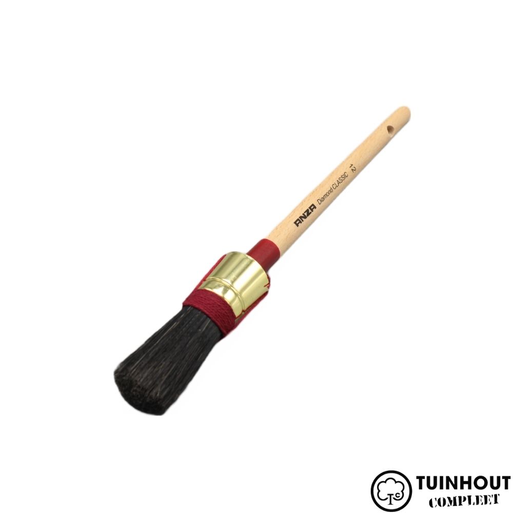 ANZA Diamond Classic Ronde kwast. De diamond classic is vervaardigd met een uitgekiende mix van zwart Varkenshaar en synthetische Vezels, met touwwoeling en geverniste beuken steel. De kop is vol-gekit met 2-componentenmateriaal om insijpelen uit te sluiten. De kwast is zeer functioneel en van hoogwaardige kwaliteit. Geschikt voor lakken op alkydbasis en alle producten op terpentinebasis.