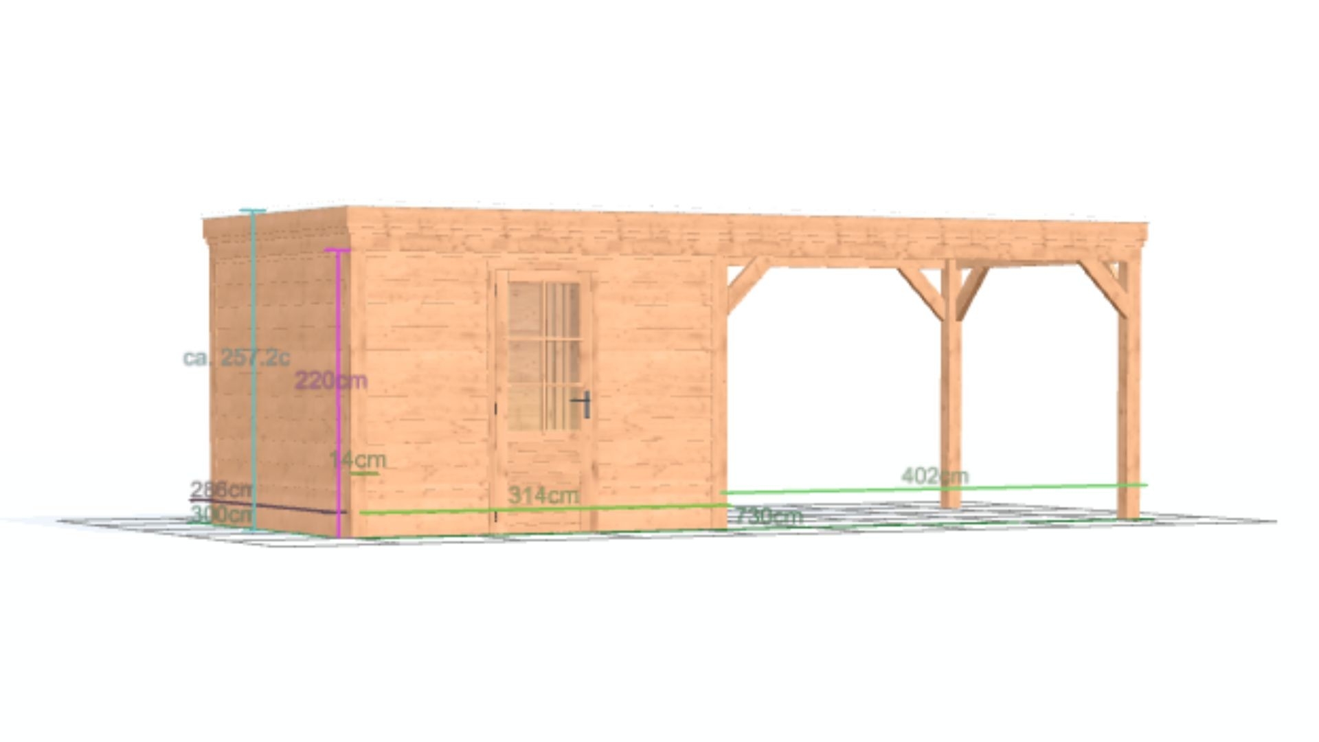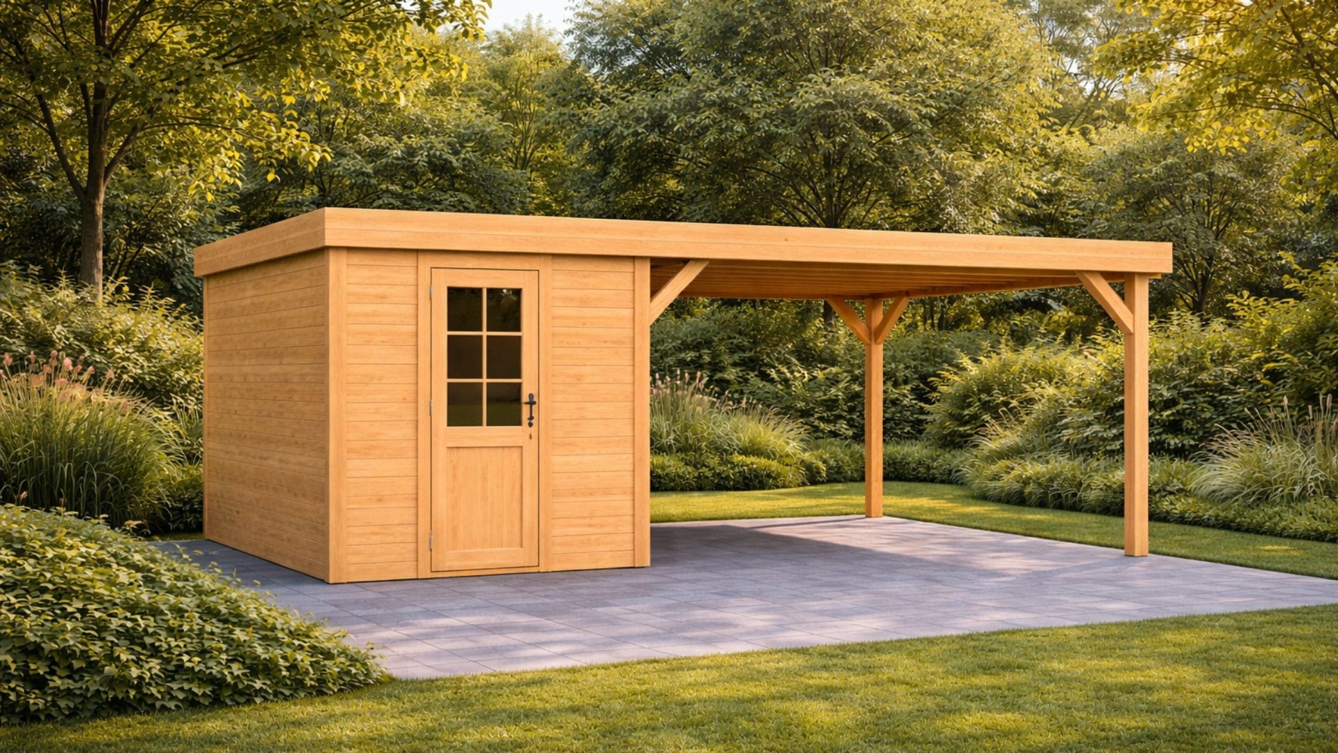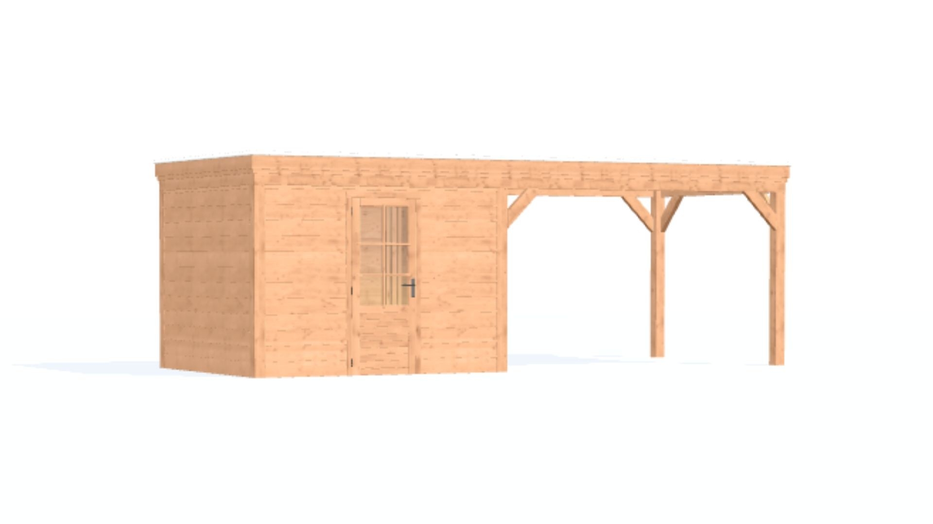 Douglas overkapping met plat dak - Comfort zonder overstek, met berging geschaafd