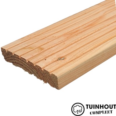 Een fraai terras of mooie vlonder aanleggen hoeft niet zo moeilijk te zijn wanneer u gebruik maakt van onze douglas vlonderplank 24x138. Deze vlonderplanken zijn aan één zijde voorzien van een grof profiel en aan de andere zijde van een fijn profiel. U kiest zelf de structuur voor uw terras uit. Door het gedroogde hout werken de planken minder. Per m² aan vlonder/terras heeft u ongeveer 6,9 strekkende meter nodig. Hoe maakt u nu uw vlonder? Plaats de planken 8 mm uit elkaar en bevestig de terrasplanken op hardhouten of onze Douglas regels. Deze regels bevestigt u om de 40 cm op een tegel of op onze Verstelbare terrasdrager. Schroef de planken vervolgens vast met een Gevel/vlonderschroef RVS van 5.0x50. Tip: Verzekerd zijn van een prachtige uitstraling én lange levensduur? Dan adviseren wij om de planken ieder jaar te behandelen met Remmers tuinhoutolie. Deze tuinhoutolie is verkrijgbaar in Remmers tuinhoutolie kleurloos basic, Remmers tuinhoutolie kleurloos eco en Remmers tuinhoutolie Douglas eco.
