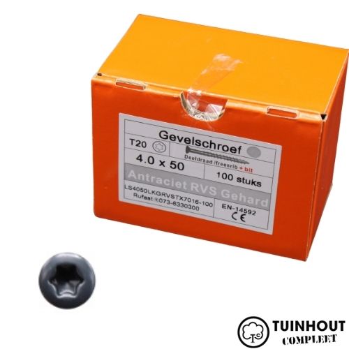 Uitvoering Met deze RVS gevelschroef bevestig je gemakkelijk planken, zweeds rabat en sponningplanken. De schroef is zelfborend, zelfverzinkend en beschikt over een torx-kop (TX20) voor de perfecte grip. De afmeting is 4 x 30 mm en de schroef beschikt over een deeldraad. Het RVS is gehard. Doordat de schroef verzinkt in het hout, is het nauwelijks nog zichtbaar na montage. Kies voor voor douglas zweeds rabat Antraciet 12-26x195.