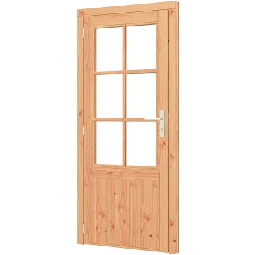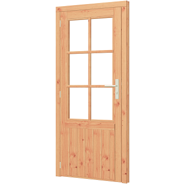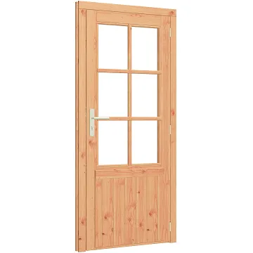 Een tuinhuis, buitenverblijf of schuur werkt u af met een douglas paneeldeur. Deze paneeldeur is linksdraaiend. Doordat het hout gedroogd en geschaafd is ervaart u een hoge kwaliteit die jarenlang meegaat. De deur wordt geleverd inclusief deurbeslag, kozijn en enkelglas raam.