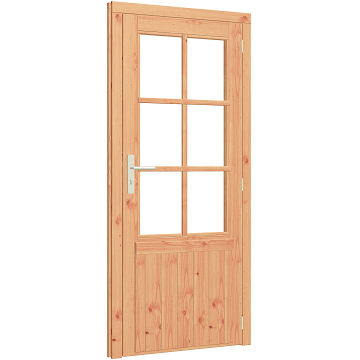 Een tuinhuis, buitenverblijf of schuur werkt u af met een douglas paneeldeur. Deze paneeldeur is rechtsdraaiend. Doordat het hout gedroogd en geschaafd is ervaart u een hoge kwaliteit die jarenlang meegaat. De deur wordt geleverd inclusief deurbeslag, kozijn en enkelglas raam.
